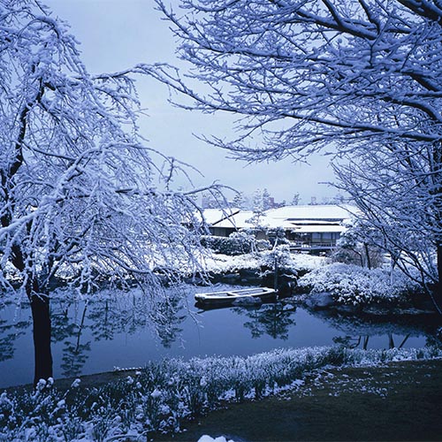 真白の雪がぬくもりを思わせる、白鳥庭園の冬。