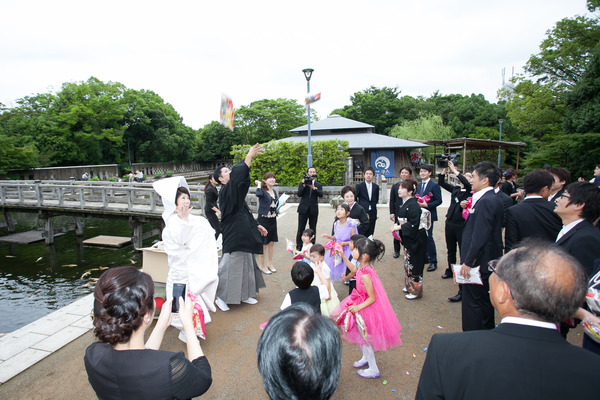 挙式後は、集合写真を撮影し、折鶴シャワーにお菓子まき♪