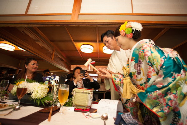 お二人は、白紋付と色打掛姿にチェンジして、ミニこも樽を開いて各卓にご挨拶周り!